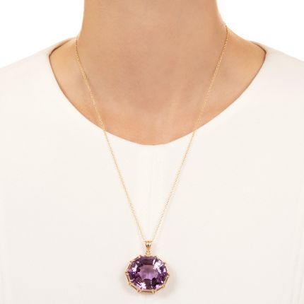 Things were big in the '80s everywhere! This estate necklace, by way of Sweden, 1985, features a gorgeous 46.00-carat watercolor purple amethyst with a cool novelty cut and an equally cool tent-like setting. A bodacious bauble—Swiss style. Hand fabricated in 18K yellow gold, it suspends from an 18-inch chain.