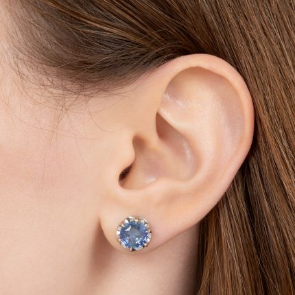 Blue in buttercups. Embraced by buttercup settings, two glorious watercolor-blue (with hints of violet) faceted round sapphires glimmer and glisten like the sun-dappled ocean in these bold and bright ear studs. Beautiful and accommodating, they look fabulous with both casual wear and the fanciest of frocks.Total sapphire weight, 5.56 carats. Hand fabricated in platinum with screw backs. Gemological report from Stone Group Laboratories states: Natural. No indications of thermal enhancements, Sri Lanka (Ceylon) origin.