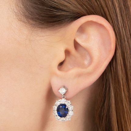 There's a reason some royals favor sapphires circled by diamonds—the effect is breathtaking. These estate earrings, extravagant in color and sparkle, glisten with two velvety cobalt-blue oval sapphires (total weight, 6.70 carats) framed, in icy white contrast, by halos of round brilliant-cut diamonds. The classic compositions dangle beneath posts set with a single diamond. For the queen in you. Total diamond weight, 3.32 carats. In platinum. GIA gemological reports for sapphires state: 3.16 carats and 3.54 carats, both heated. Thailand - origin.
