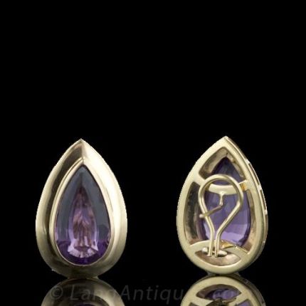 Enhance any outfit with these 14 karat yellow gold Amethyst earrings. The bold bezel style earrings have pierced posts and omega clip backs and measure approximately 1 1/4 x 3/4 inches. Each earring is set with an elongated pear shaped amethyst displaying a pleasing violet body color. The matched gemstones have a total weight of approximately 17 carats.