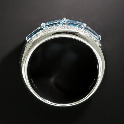 Eight azure blue emerald-cut aquamarines form a glistening river of blue around your finger, outlined with small sparkling white full-cut diamonds, in this distinctively chic and stunning band ring rendered in gleaming platinum. Just shy of a half-inch wide and tapering toward the back. Currently ring size 6 1/2.