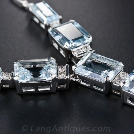 Six shimmering pastel-blue aquamarines are artfully arrayed in a modern rendition of a classic geometric Art Deco design and enlivened with small diamond sparklers in this chic and sophisticated necklace. The necklace measures 18 inches in length plus a one-inch center drop. The aquas total 13.00 carats.