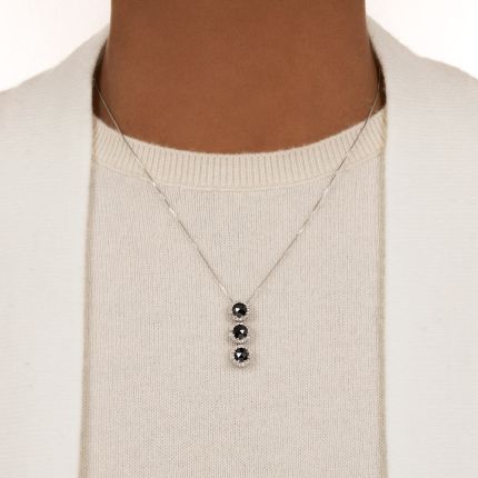 A trio of gleaming geodesic black rose-cut diamonds, together weighing 1.95 carats, are each encircled by a sparkling halo of small bright-white round brilliant-cut diamonds, in this cool, understated drop necklace rendered in 18K white gold. 2.46 carat total diamond weight. Chain adjusts to 18 inches.