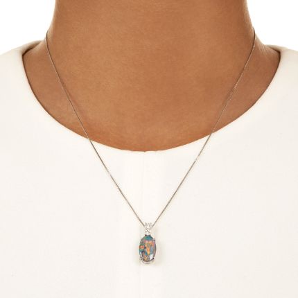 In this captivating estate necklace, a striking black opal, appearing to contain flames—as well as flashes of iridescent blue and green—is crowned in sparkling contrast by a pair of scintillating round brilliant-cut diamonds. The riveting composition of riotous color and light suspends from a silky box chain that is adjustable to 17 inches. Total diamond weight, .29 carat. Crafted in platinum.