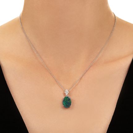 Like the dark and colorful beauty of outer space, the black opal in this estate pendant captivates with an electric play of color in vibrant hues of green and blue. Crowned in striking contrast by a quarter of bright round brilliant-cut diamonds, it suspends from a rolo chain that adjusts from 14 1/4 - 15 3/4 inches.