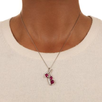 A tantalizing trio of Burmese rubies, together weighing 3.07 carats, cast a rich, radiant pinkish-red glow in this striking, sleekly styled modern pendant necklace rendered in 18K white gold. Measuring 1 3/8 inches, the sweeping design is modestly embellished with 14 tiny twinkling full-cut diamonds. The fine box link chain measures 18 inches. Rubies accompanied by a gemological report from Stone Group Laboratories stating: Evidence of treatment with residues. Myanmar (Burma) - origin.