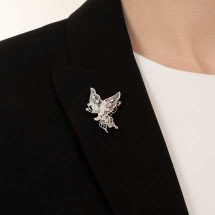 Fluttering about with its filigree wings, this bonny butterfly twinkles all over with 38 crisply sparkling, bright white round brilliant-cut diamonds and is migrating--to your neckline (or lapel). Total diamond weight, .36 carat. In 18K gold, it suspends from an 18-inch chain.