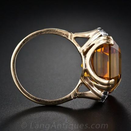 A fabulous golden honey color emerald-cut Citrine glistens and glows from this mid-century smile inducer with a scalloped pattern of sparkling white diamonds adorning each side. Superbly crafted in 14K yellow gold and platinum.