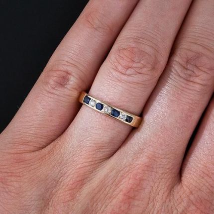 Three sparkling full-cut diamonds alternate with four round faceted royal-blue sapphires, channel set in 14 karat yellow gold in this delightful and durable everyday wedding band.