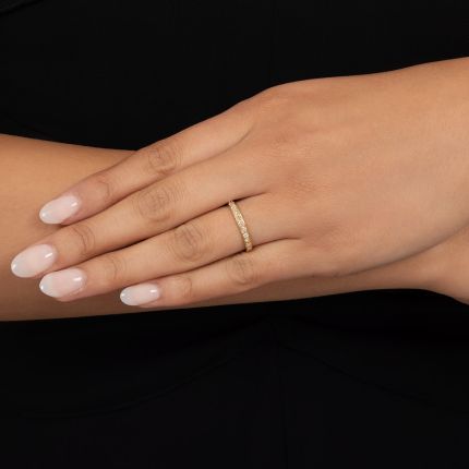 Add extra sparkle to your engagement ring--or to your favorite set of stacking bands--with this sleek jewel that shines across the top with 15 scintillating single cut diamonds. Simply perfect. Total diamond weight, .35 carat. Crafted in 18K yellow gold, currently ring size 7.
