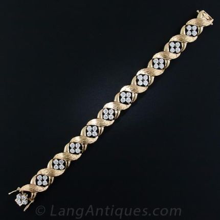 A bright and sparkling estate diamond bracelet with clusters of four round brilliant-cut diamonds glistening from the centers of textured and bright polished 'X' links. A flashy, splashy, substantial and fun bracelet dating back to the 1970s.