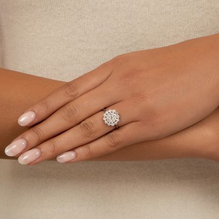 Sparkle, sparkle! It begins with a brilliant central cluster of closely set, icy-white round full-cut diamonds and culminates with a scintillating halo composed of the same, bringing the total diamond weight of this dynamic dazzler to 1.00 carat. Shine on! Rendered in gleaming platinum. Currently ring size 7.