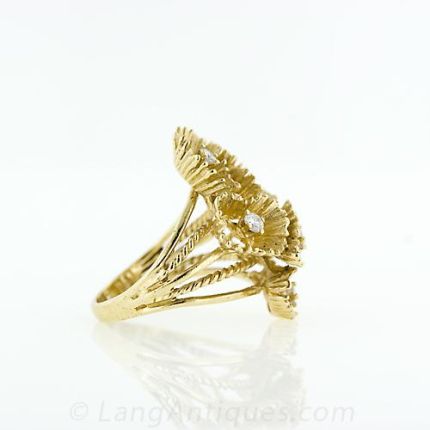 Unique 14K yellow gold, 3 dimensional, stylized flower-motif ring, contains 6 prong-set round brilliant-cut diamonds. The crown of the ring measures approximately 1 1/4 inch in length and 7/8 inch in width.Diamond Description:(6) Round, full-cut diamonds 0.50 carat total weight I-J color SI2-I1 Clarity