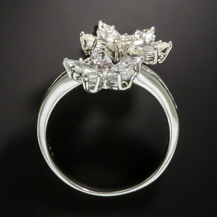 Just for you --a dazzling duo of flowers that will never wilt or lose their petals. The subtle variations in diamond colors are beautifully represented in this artfully designed estate ring. Composed of marquise diamonds centered with a round brilliant-cut, one flower has near-colorless petals with a light pink center, the other has petals with a bright sunshiny hue and a brownish-yellow center. The beautiful blooms are joined by a gracefully curving "stem" of gleaming baguette diamonds. Lovely. Total diamond weight, 2.12 carats. In platinum, currently ring size 8.