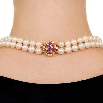 Estate Double-Strand Cultured Pearl Necklace with Ruby and Diamond Clasp