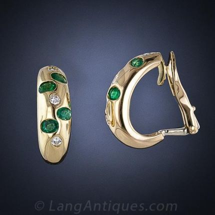 Fun and funky partial earhoops, crafted in 18K yellow gold and sparkling with randomly set oval emeralds and round brilliant-cut diamonds. Signed 'élan'.