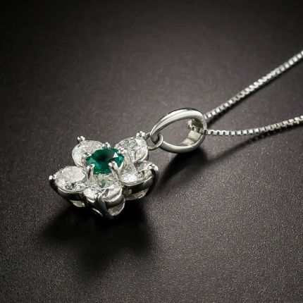 A petite but powerful, gemmy, faceted round emerald radiates from the center of five bright icy-white sparkling diamond petals in this classic estate drop rendered in gleaming platinum. .88 carat total diamond weight. Just over 3/8 inch across, the platinum chain measures 18 inches.