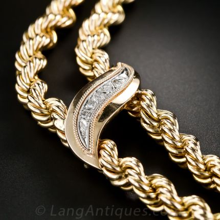 A classic twisted rope chain, rendered in gleaming 14K yellow gold and enhanced with a flash of sparkling single-cut diamonds, culminates in a pair of dancing tassels in this fun, festive and very versatile 16 inch necklace.