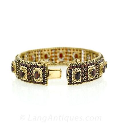Deriving its name from the seeds of the Pomegranate fruit, garnets have been a beloved gem for many centuries. This beautifully crafted bracelet of 18 karat yellow gold is comprised of pierced design links having a scintillating texture which compliments the fifteen oval garnets set into each center. Framing each link are fourteen round garnets and a box chain is appliqued as a border. The bracelet measures 7- 1/2 inches in length and is secured by an integrated plunger clasp.
