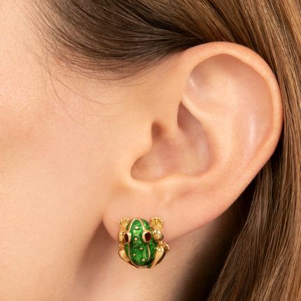 Faithfully modeled from the David Webb originals (indistinguishable except for the missing Webb stamp), these fancy amphibians are playing a special game of leapfrog. Shimmering with bright green enamel and red eyes, they are way too cool for the lily pad and are 'hopping' to find a new home—on your ears! Crafted in 18K yellow gold.