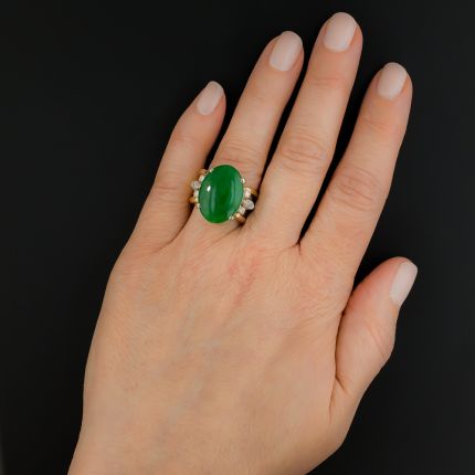 An impressively proportioned (3/4+ by 9/16 inches) double cabochon natural Burmese Jade, richly saturated with a translucent deep forest green hue, is stylishly presented between a pair of marquise diamonds, each flanked by a pair of small round brilliant-cut diamonds, in this striking estate ring hand fabricated 14K yellow gold with a triple split ring shank. Accompanied by a gemological report from Stone Group Laboratory stating: Natural. No indications of polymers or dyes. Burma origin. Currently ring size 7 1/2.