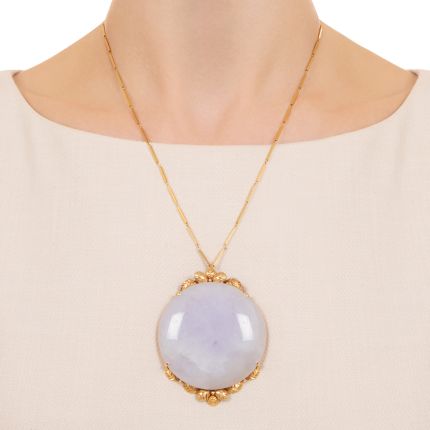 Green jade, in all its varying hues, has been revered for centuries and is indeed a breathtaking stone. But all jade is not green, and this arresting pendant presents one of the gem's most enchanting and rare colors—lavender. Measuring an impressive 2 7/8 inches, the soft violet cabochon jade is adorned above and beneath with sprays of shimmering, textured leaves, suspends from a sleek 19-inch bar chain, and makes a stunning statement piece. Hand fabricated in 18K gold. Accompanied by a gemological report from Stone Group Laboratory stating: Natural. No indications of polymers or dyes. Burma origin.