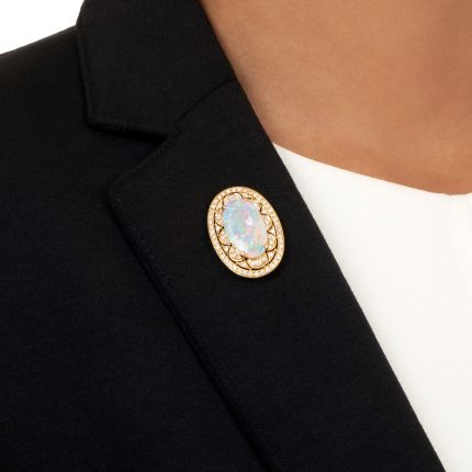 Like a sunset, an opal is new every day. With each turn of the stone, a different and utterly delightful play of color appears. The 3.00 carat Australian gem that centers this striking estate pendant/brooch radiates with a glorious kaleidoscopic display of iridescent hues in orange, blue, green, and red, all enhanced by a scalloped frame aglitter with round brilliant-cut diamonds and further encircled by a diamond-set halo. Crafted in 18K yellow gold, the alluring assemblage suspends from an 18-inch chain and can also be worn as a brooch. Total diamond weight, 1.15 carats.