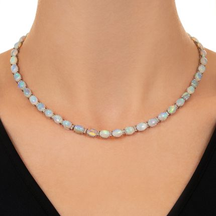 Ninety-six. Ninety-six little universes of irrepressible, iridescent color and glowing light—in the form of Australian opals, of course—are interspersed with tiny twinkling diamonds, all together creating a magnificent play of color and sparkle to orbit your neck. Total opal weight - 29.20 carats, total diamond weight - .60 carat. Crafted in 18K white gold, it measures 16 1/2 inches.