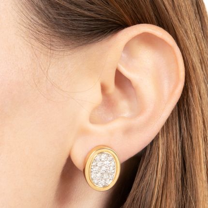 Paved in sparkle. Encircled by bright gold frames, the round brilliant-cut diamonds in these light-up-your-lobes earrings are pavé set, a technique by which they are positioned very close together and laid out in concentric circles. The effect is a swath of shimmer that brightens both your face and your ensemble. Total diamond weight, 1.25 carats. Crafted in 18K yellow and white (diamond settings) gold.