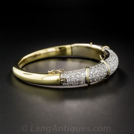 5.65 carats of high-quality, brilliant-cut diamonds glisten and sparkle in this well constructed hinged bangle bracelet crafted in rich 18k yellow and white gold. The diamonds cover a full half of the bracelet. A beautiful bargain!