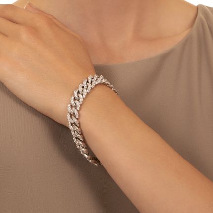 From our Antique Jewelry University: A curb link is a chain composed of links that have been twisted and flattened. In this elegant estate bracelet, the curb links are pavé-set with 232 ultra-white and spectacularly sparkling round brilliant-cut diamonds designed to effortlessly encircle the wrist while creating a dazzling display of light. A stunning and utterly unique twist on a classic that elevates the traditional to the exceptional. Total diamond weight, 13.00 carats. In 18K white gold, from Italy, it measures 7 1/8 inches.