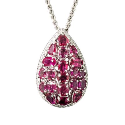 Glimmering with 20 luscious raspberry-colored rubies in mixed shapes---heart, pear, oval--this bright and beautiful teardrop pendant is rimmed with tiny, shimmering round brilliant-cut diamonds and suspends from a 16-inch rope chain. A fabulous pop of color for your neckline. Total ruby weight - 4.73 carats, total diamond weight - .39 carat. In 18K white gold.