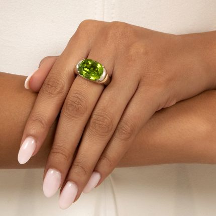 An electric shock of gorgeous bright apple green. Set in an east/west position, a near-neon, lime-green cushion-shaped peridot, weighing 10.70 carats, is held by a bold, bright, sculptural mounting of 18K yellow and white gold, and is ready to banish dull days. Currently ring size 8 3/4.