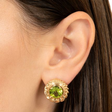 Enliven your lobes with these bright and bold estate earrings. Each one shines with an electric lime-green peridot in a surround of high-polish 'twisted' gold, and together will frame your face with fabulous color. Total peridot weight, 7.15 carats. Crafted in 18K yellow gold.