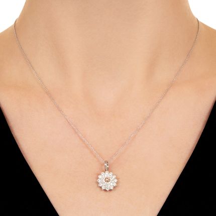 A bright cluster of light—plus a spot of color—for your neckline, courtesy of this delightful estate pendant. A single round brilliant-cut diamond with a warm pinkish-brown hue stands out all the more in a surround of exceptionally white and lively round brilliant cuts, creating a splash of sparkle that suspends from an 18-inch platinum chain. Total diamond weight, .82 carat. Crafted platinum (center diamond setting is 18K rose gold).