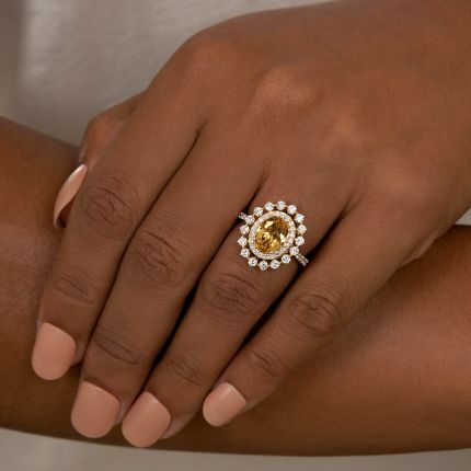 In this bright and beautiful estate jewel, an enchanting gemstone--a faceted oval precious topaz, weighing 2.00 carats--casts a gorgeous golden glow from within double halos of bright-white and sparkling round brilliant-cut diamonds, supported by a ring shank aglitter with diamond-set shoulders. Total diamond weight, 1.00 carat. Crafted in 14K yellow gold, currently ring size 6 1/2.
