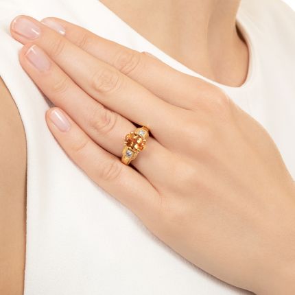 Having a color plucked straight out of a sunset, precious topaz is also known as imperial topaz, since the Russian tsars of the 17th century claimed exclusive rights to the stones mined in Russia. The captivating 3.40 carat stone in this ring glimmers with a peachy golden color and sparkles on its shoulders with princess-cut diamonds and on its gallery with lively round brilliants. The bright 18K yellow gold mounting is thoroughly hand-engraved all around and on three sides with an array of decorative patterns that create a shimmering textured finish. An imperial stone for the empress in you. Total diamond weight, .39 carat. Currently ring size 6. Note: ring is fitted with a flexible sizing band.
