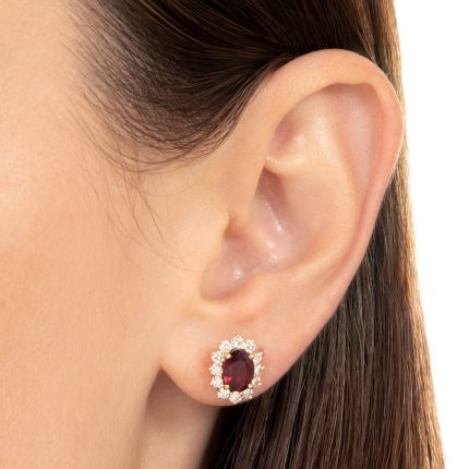 In this classic pair of estate earrings, a pair of glimmering, deep cherry-red rubies, together weighing 1.25 carats (but presenting considerably larger due to the shallow cuts), are surrounded by ultra-sparkling halos of bright white round brilliant-cut diamonds. Regal beauties. Rendered in 18K yellow gold. Total diamond weight, .70 carat.
