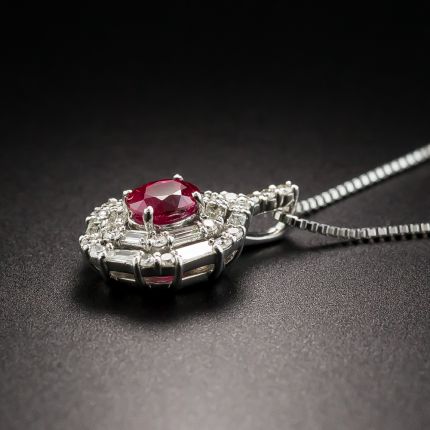 Here's a different interpretation of a colored gemstone surrounded by diamonds. Instead of exclusively round stones, the vibrant .47 carat deep pinkish-red ruby in this pendant is framed by baguette diamonds punctuated by trios of round brilliants, creating an overall hexagonal shape. Chic. The ultra-fine Venetian chain adjusts to 17 3/4 inches. Rendered in platinum.