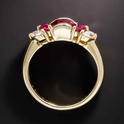 Mirror-image ribbons of vibrant, seamlessly-set crystalline candy apple-red rubies are bookended by pairs of sparkling icy-white marquise diamonds in this chic and distinctively stunning estate jewel rendered in rich 18K yellow gold. Total ruby weight - 1.04 carats, total diamond weight - .33 carat. Currently ring size 5 1/2.