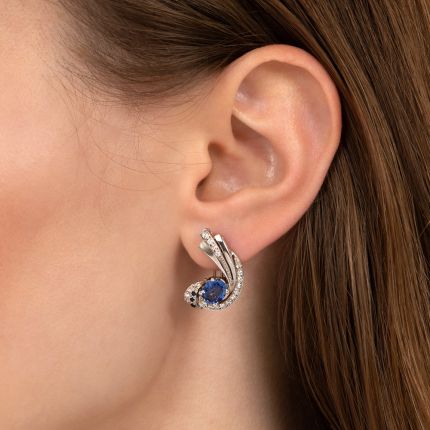Brightly polished and diamond dusted 14K white gold ribbons swirl around glimmering gorgeous cornflower blue sapphires (total weight, 2.55 carats), in these lobe-hugging estate jewels. Trios of tiny deep blue sapphires add a final dash of detail. Total diamond weight, .33 carat. Accompanied by a gemological report from Stone Group Laboratories stating: Indications of Thermal Enhancement, Ceylon - Origin.