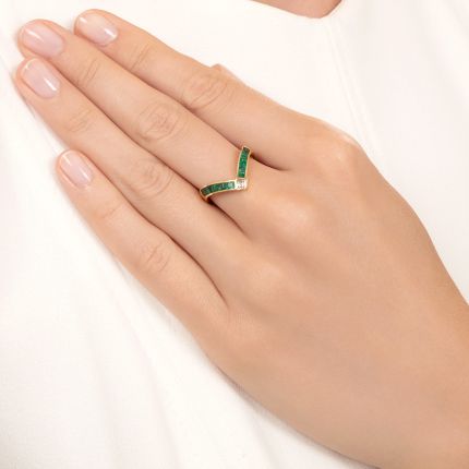 One of the oldest symbols, dating back to the Neolithic Era, the chevron shape has been used in heraldry, on flags, in architecture, and as a striking decorative design pattern. This elegant estate stack presents a trio of chevron-shaped rings, each set with a square-cut diamond and each glistening with a different gemstone—emeralds, sapphires, and rubies. Together, they create a colorful wing-like effect around a scintillating column of sparkle. Who knew chevrons could be so chic? Total colored gemstone weight,1.80 carats. Crafted in 18K yellow gold, the rings are currently size 6 3/4.