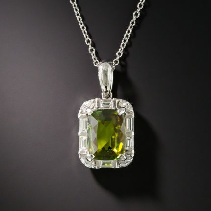 When someone asks you, "what is that lovely iridescent, golden tinged olivine gemstone around your neck?", you can proudly reply, "Why, it's a Sphene!" (although it's a often mistaken for an Alexandrite). This unusual and exotic cushion-cut gemstone, weighing 1.78 carats, is elegantly displayed in a platinum frame composed of gleaming baguette diamonds punctuated on each corner with a small oval diamond. .50 carat total diamond weight. (Substantially reduced in price due to a small, virtually imperceptible chip on one side of the stone.) Half-carat total diamond weight. 1/2 by 3/8 inch (not including the loop). The platinum chain measures 18 inches. Condition Note: Sphene has a chip