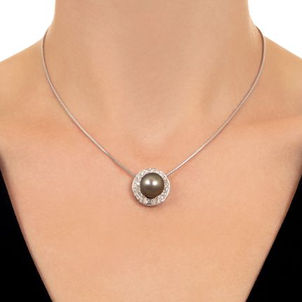 In 1891, French artist Paul Gaugin headed to Tahiti to escape modern Europe. The beauty and the culture of French Polynesia enthralled him and were the inspiration for his strikingly vivid and intriguing paintings during that time. While his paintings reflected his captivation with Tahiti, the waters of the island produce their own captivating creations—pearls. One of those pearls is presented in this arresting estate necklace. Bearing a dark silvery color with purple overtones, the lustrous ocean gem is orbited by a halo of glittering, bright white round brilliant-cut diamonds accented with a single channel-set princess-cut diamond, and suspends from a silky, sinuous snake chain. Inspiring, indeed. Total diamond weight, 1.03 carats. Pearl measures 12.88 x 13.22 x 12.44mm. Chain measures 16 1/4 inches.