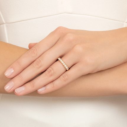 Twinkle x 10. Ten lively round brilliant-cut diamonds shine across the top of this classic wedding band with a subtle twist. The difference? It has a cool squared shank, adding a contemporary edge to a traditional design. Total diamond weight, .55 carat. Crafted in 18K yellow gold, it is currently ring size 5 1/2.