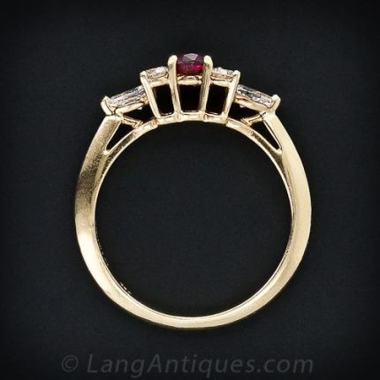 A sweet and petite ruby and diamond ring from Tiffany & Co. A .30 carat round cut vibrant red ruby is enhanced by both high quality round brilliant and pear cut diamonds. A classic from Tiffany.