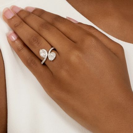 Representing the entwining of two hearts and souls, it is befitting that the dazzling pear and marquise diamonds in this toi et moi ring are perfectly matched, both having D color and SI1 clarity. The shoulders of the ring, shimmering with bright, icy-white round brilliant-cut diamonds, bypass one another, gracefully embracing the featured stones, creating an exquisite composition of sweeping curves and sparkle. Total diamond weight, 1.88 carats. Crafted in 18K white gold, it is currently ring size 5 1/4. GIA Diamond Grading Reports state: D color - SI1 clarity.