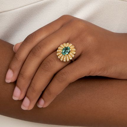 In the center of shimmering 'petals,' frosted with 48 twinkling round brilliant-cut diamonds, a 1.61 carat oval tourmaline glistens and glimmers with a lovely light teal blue hue. The alluring composition is set in bright 18K gold and is supported—in striking contrast— by a lustrous platinum under gallery and shank. A delightful bloom of color and light to grace your finger. Total diamond weight, .45 carat. Currently ring size 6 3/4.