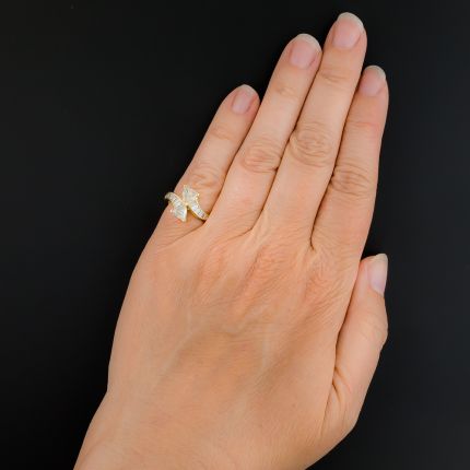 While the direction may not be clear, the diamonds in this chic and stylish bypass ring certainly are. The sleekly curved band is seamlessly set with flashing bright-white baguette diamonds culminating with a pair of super scintillating trillion diamonds (together weighing 1.00 carat). Whichever way you go, it makes a stunning statement. Total diamond weight, 1.55 carats. In 18K gold, currently ring size 4 1/2.
