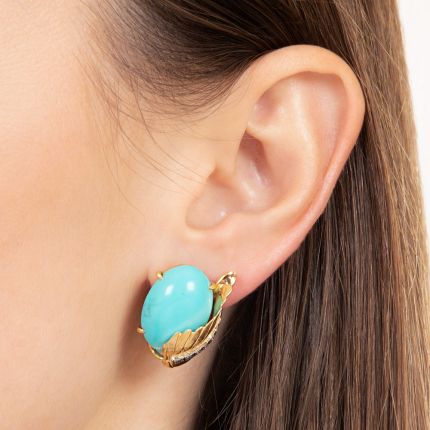 Estate Turquoise and Diamond Leaf Earrings - GIA